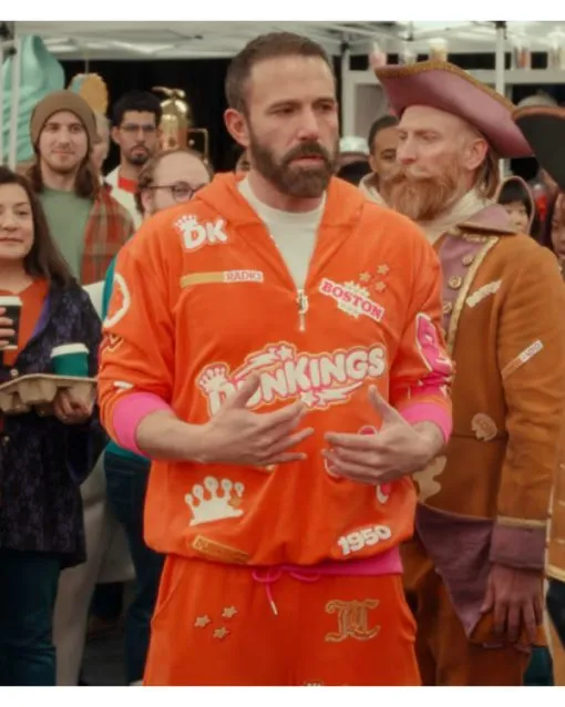 Make a bold statement with the Ben Affleck tracksuit, famously worn by the actor during his hilarious and viral Dunkin’ Donuts Super Bowl commercial. This vibrant orange ensemble became an instant pop-culture sensation, capturing Ben Affleck’s playful energy as he led the “DunKings” musical group on screen. The Ben Affleck Super Bowl tracksuit is the ultimate choice for fans who want to combine a sense of humor with a standout streetwear look. Whether you are heading to a casual hangout or simply want to replicate this iconic marketing moment, this tracksuit offers a fun and energetic aesthetic that is impossible to ignore.