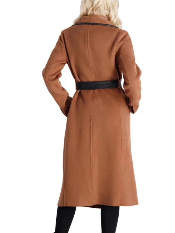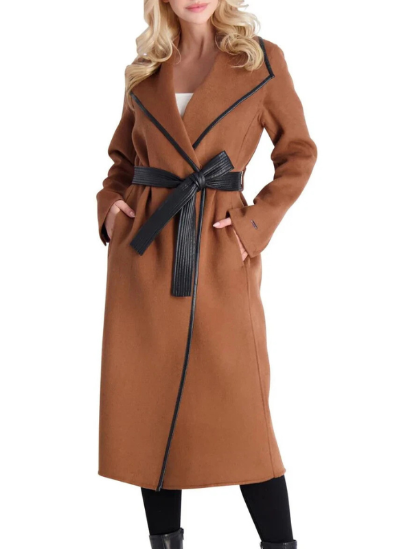 The coat demonstrates its top-notch quality by utilizing premium wool fabric to meet the season’s demands for warmth. Inside, a smooth viscose lining ensures you stay in your comfort zone, providing a relaxing fit whether you are at a high-stakes event or a casual city stroll. Featuring a mesmerizing wide notch lapel collar and an elegant belted closure, it creates a tailored silhouette that flatters every move. With its rich brown hue and distinctive leather trim, this coat ensures that nothing feels restrictive – everything feels unstoppable.
