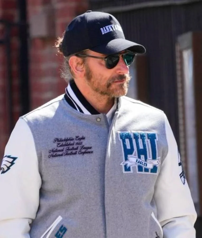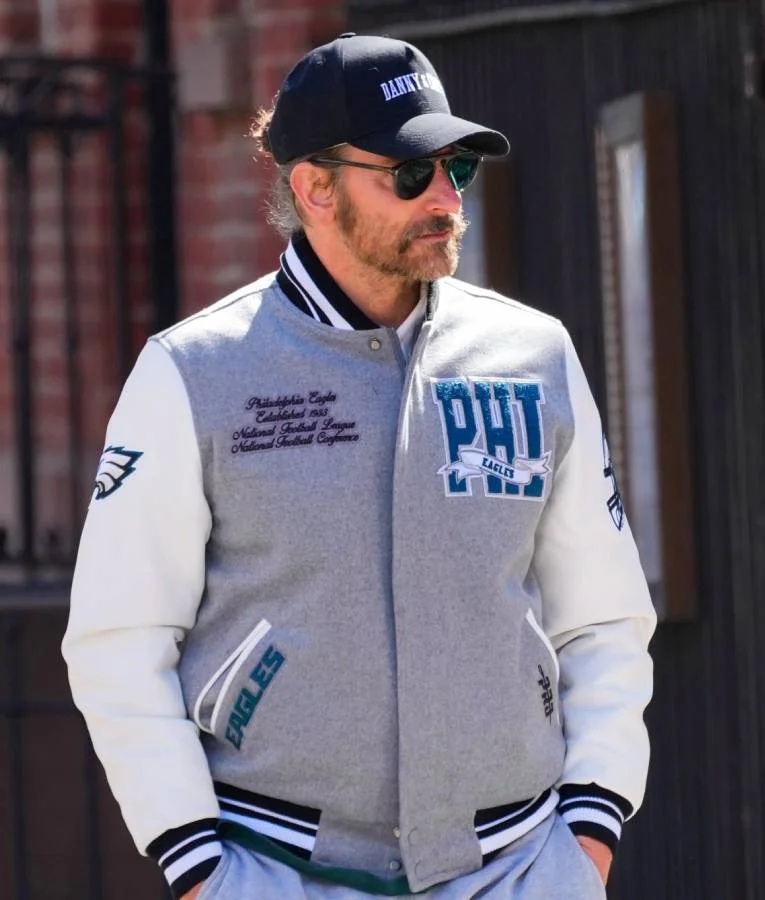 Bradley Cooper NYC 2025 PHI Eagles Chenille Patch and Snap Button Grey & White varsity Jacket