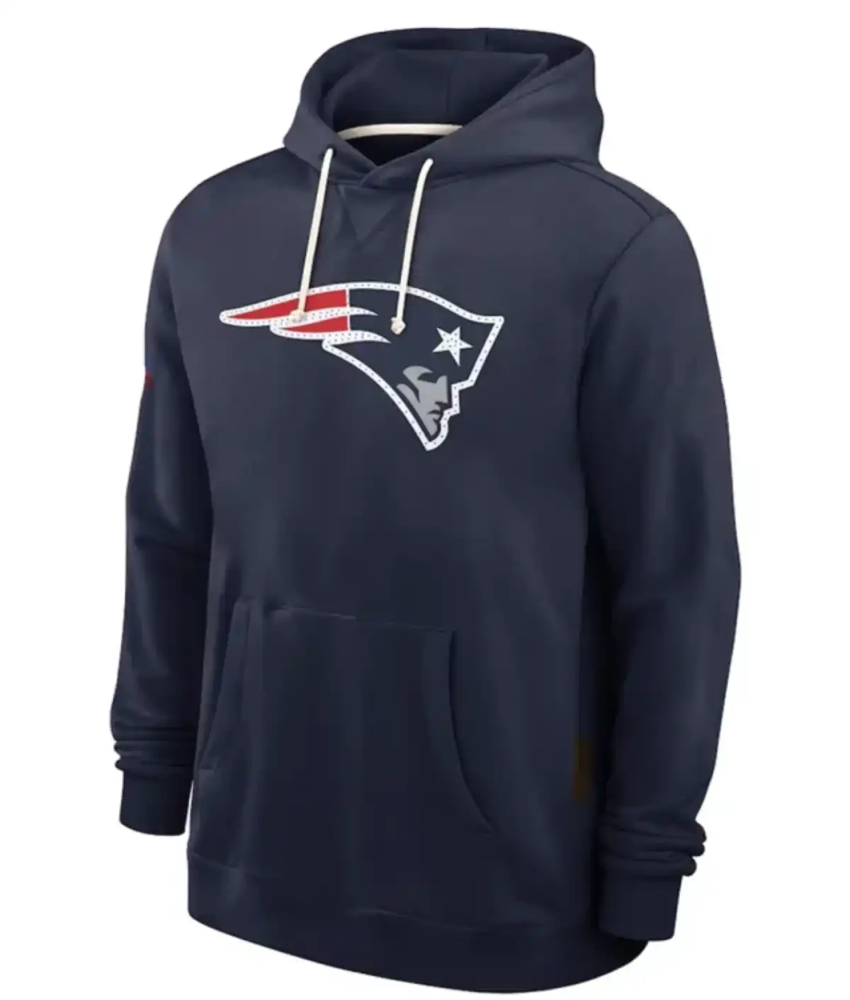 This hoodie is crafted from high-quality fleece fabric, providing exceptional warmth and a soft, comfortable feel against the skin. The interior features a smooth viscose lining for added comfort and breathability. Designed with a practical hooded collar and a convenient pullover style, it offers easy wear and a relaxed fit. The navy blue color is complemented by full-length sleeves and ribbed cuffs to keep the cold out. Complete with a spacious pouch pocket for hand warmth or storage, this hoodie is a must-have for any dedicated Patriots fan.