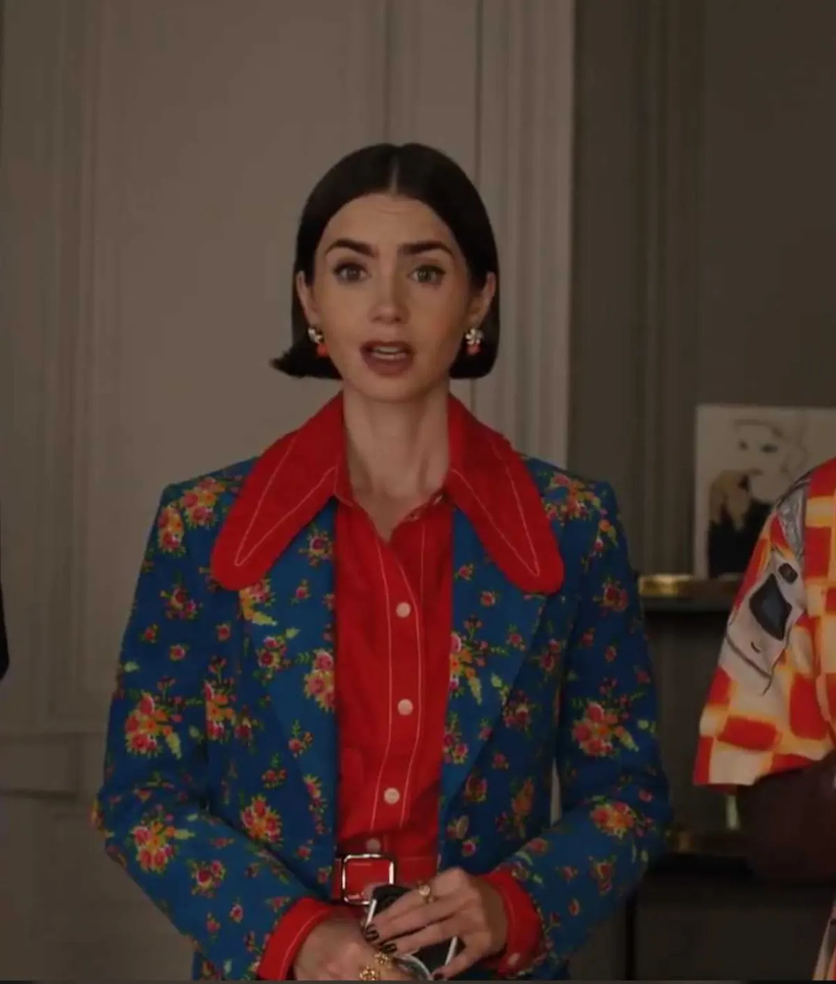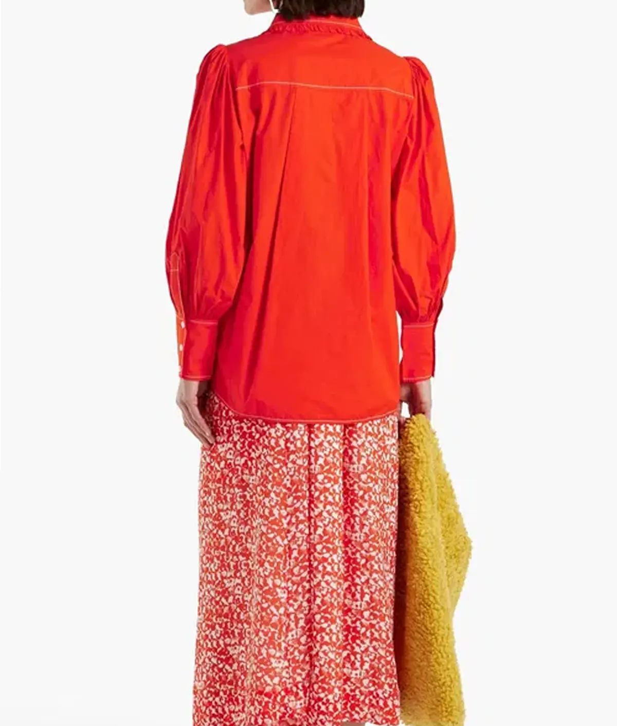 Step into the streets of Paris with the same bold confidence as your favorite marketing executive with the Emily Cooper poppy orange shirt. Inspired by the latest fashion-forward looks from Emily in Paris Season 5, this shirt is a masterclass in playful elegance. The vibrant poppy hue and intricate white contrast stitching perfectly capture Emily’s “more is more” aesthetic. If you are looking to buy celebrity-inspired Parisian fashion that features romantic ruffle trims and dramatic bishop sleeves, this cotton poplin shirt is a must-have for your 2026 spring and summer collection.