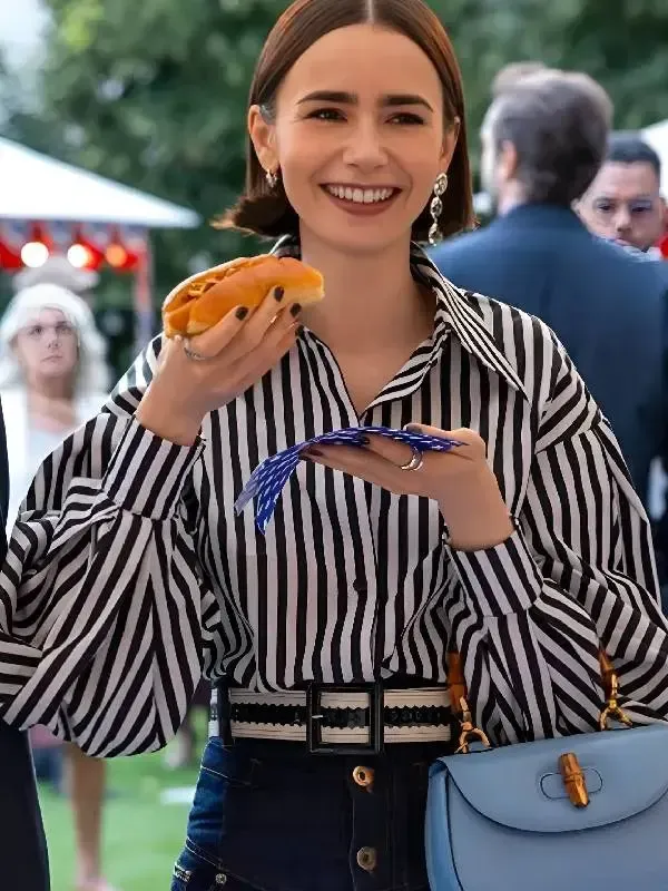 Bring the charm of the Roman holidays to your wardrobe with the Emily In Paris S05 Lily Collins shirt, a delightful piece inspired by Emily Cooper’s latest adventures in Season 5. As the show moves its focus toward the scenic streets of Italy, Emily continues to lead the way in playful, high-fashion trends. This Emily In Paris S05 Lily Collins striped shirt captures her signature “maximalist” style, blending a classic pattern with a modern, feminine silhouette that is perfect for fans of the show’s iconic costume design.