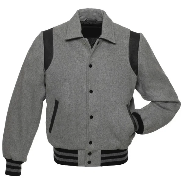 Men’s Leather Shoulder Accents, Snap-Button Closure, and Striped Ribbed Hem Grey & Black Varsity Jacket