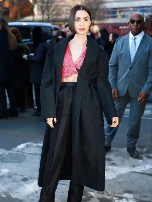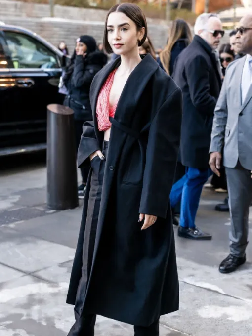 Exude effortless sophistication with the Lily Collins Calvin Klein coat, a masterpiece of minimalist luxury inspired by her appearance at the prestigious 2026 fashion show. Lily Collins, celebrated for her impeccable “Parisian chic” style, stunned photographers in this sleek black silhouette, perfectly embodying the modern elegance of the Calvin Klein brand. This Lily Collins Calvin Klein show black coat is the ultimate investment piece for fashion-forward individuals seeking a high-end look that transitions seamlessly from the front row to professional city life.
