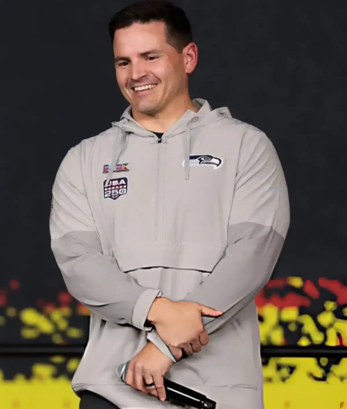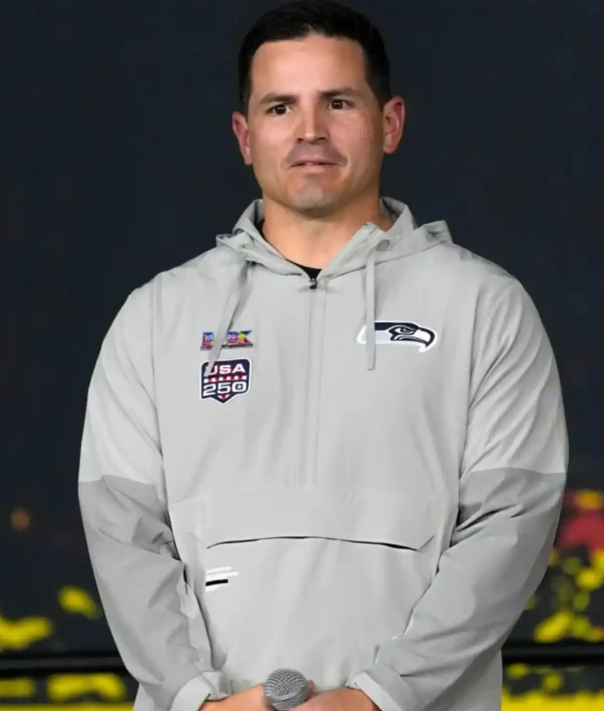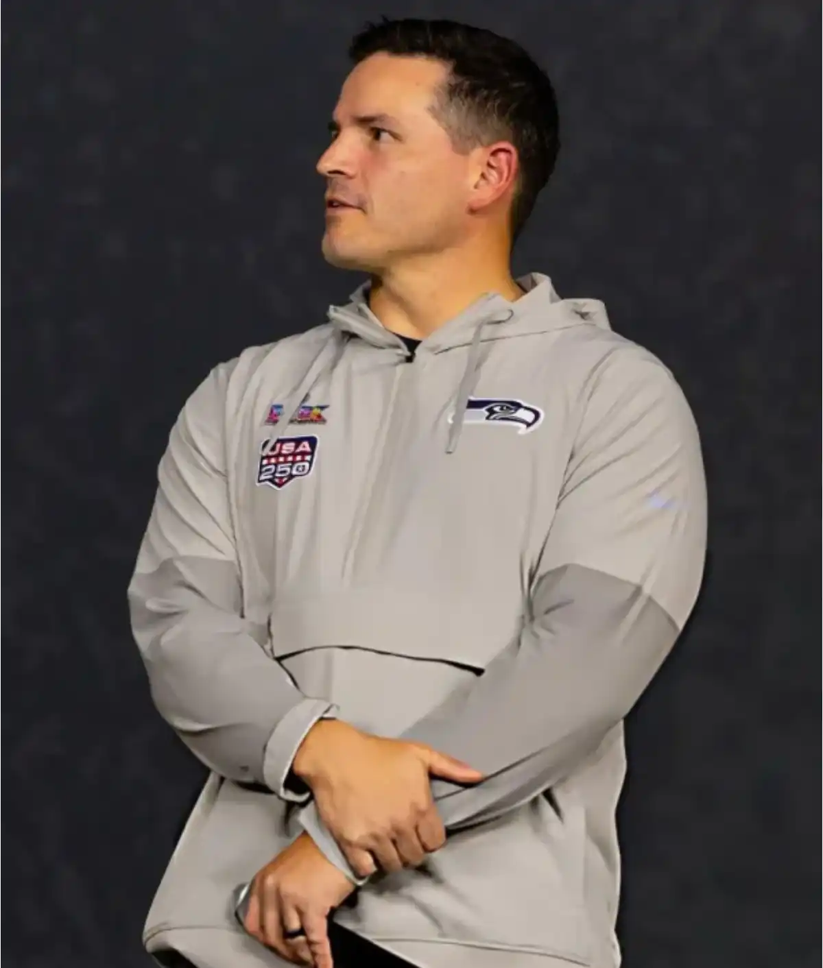 Mike MacDonald Super Bowl LX Opening Night Seattle Seahawks Logo, USA 250 Patch Grey Half-Zip Anorak Hoodie Jacket